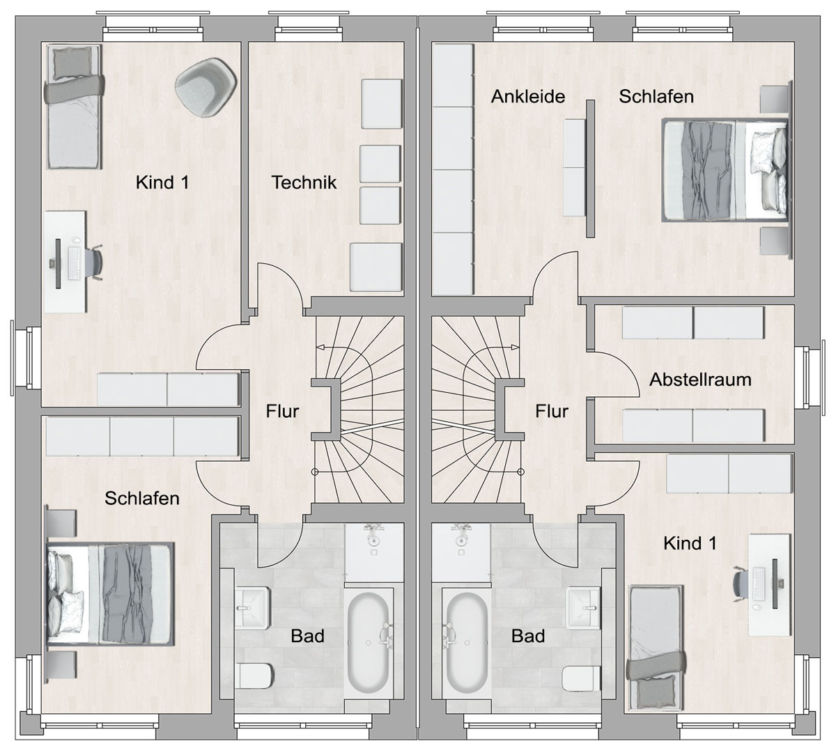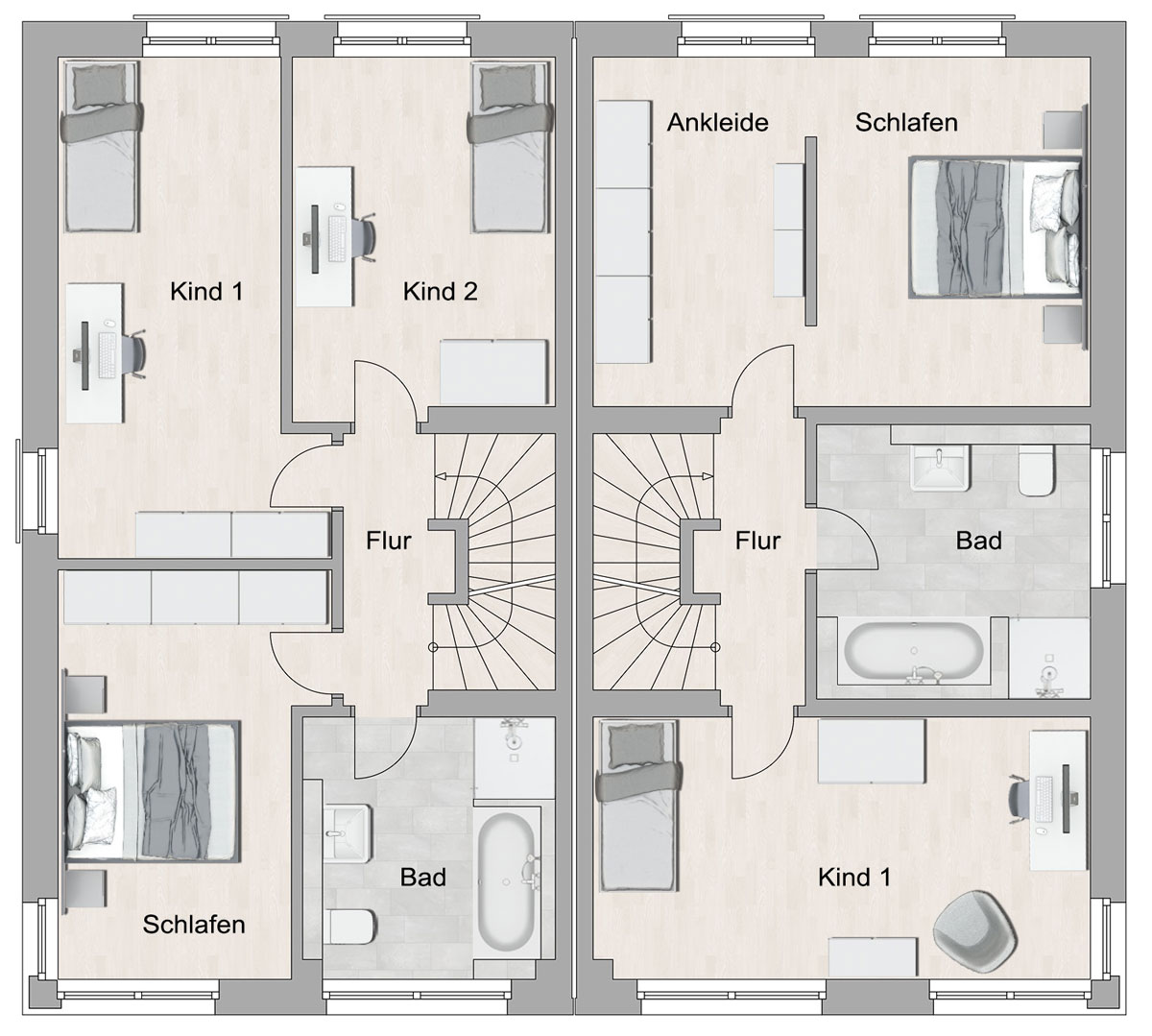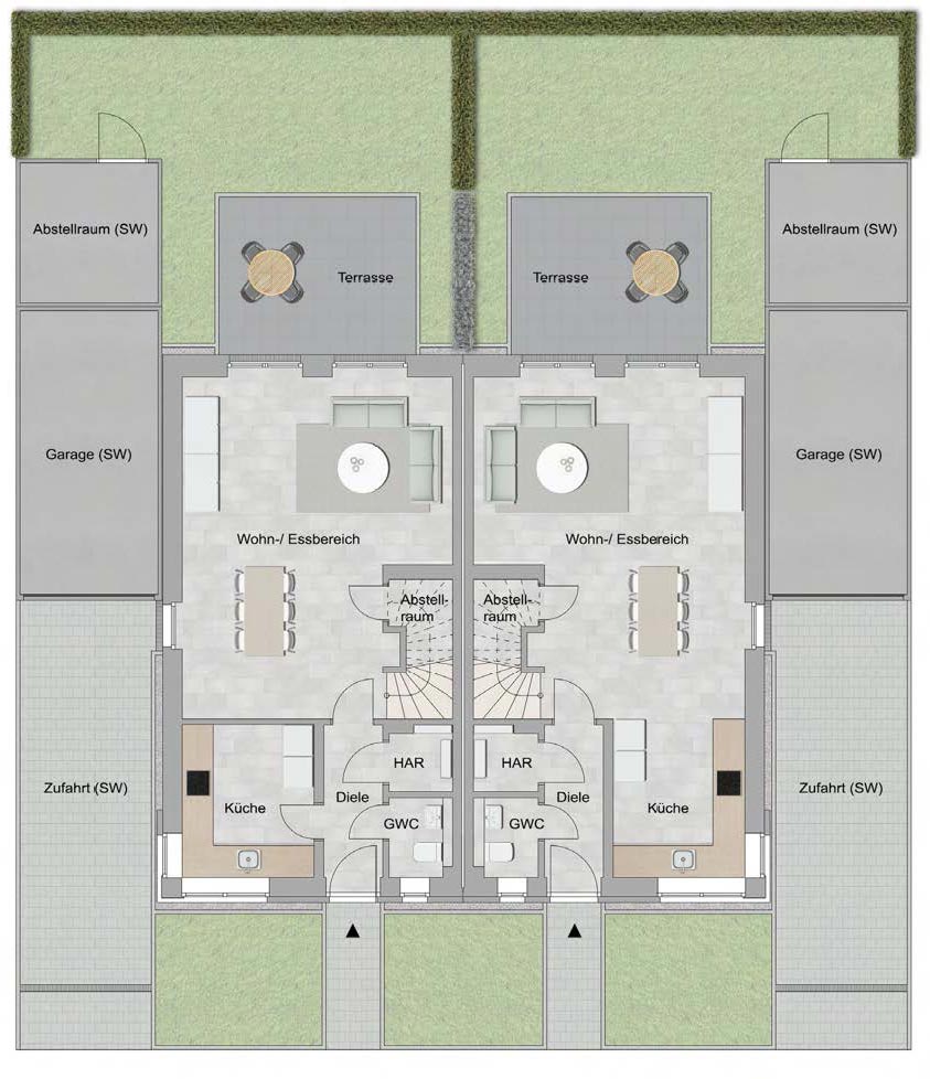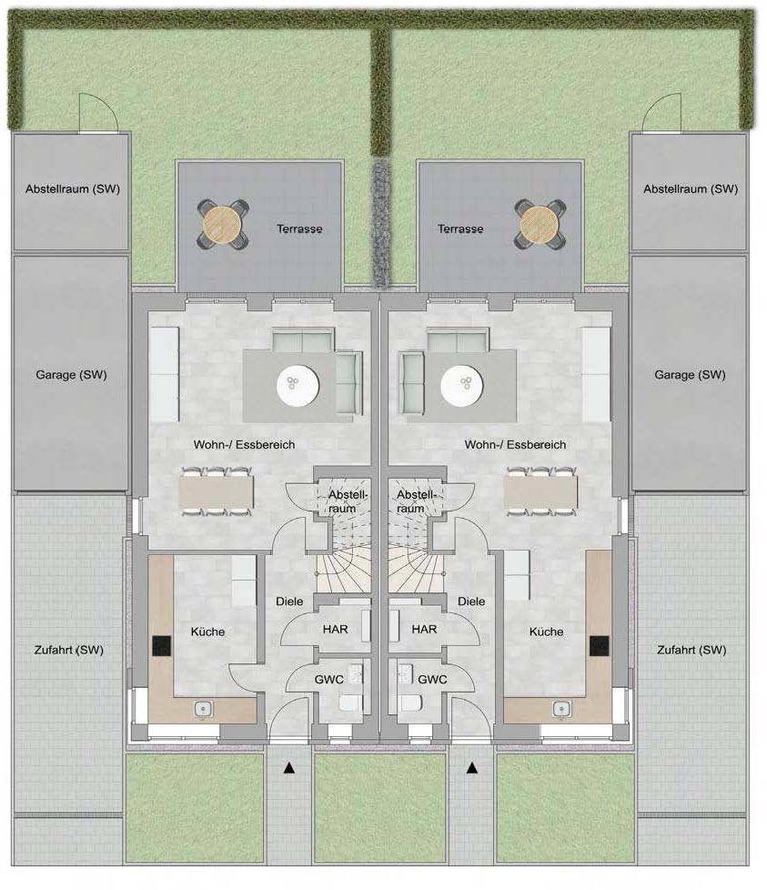Die dargestellten Grundstücksflächen in den Erdgeschossgrundrissen sind allgemein gehalten. Bitte fragen Sie den individuellen Grundstückszuschnitt zu jedem Haus bei Ihrem Verkäufer an.